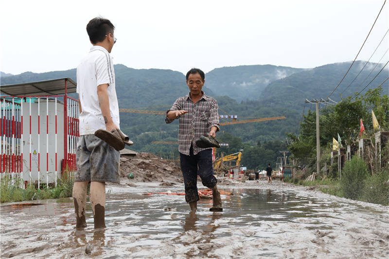 8月18日下午,在草壩青衣江大橋建設現場,項目部外的院壩、工地附近的道路,均覆蓋著厚厚的淤泥!白蛲砭o急撤離,我的車停在河邊,也沒來得及開走,現在都沒找到!币荒樒v的李勁松告訴記者,雖然洪水漲勢迅猛,但他們撤離之前,提前通知了電力部門斷電,否則若有人再次靠近洪水,將面臨觸電的風險。
