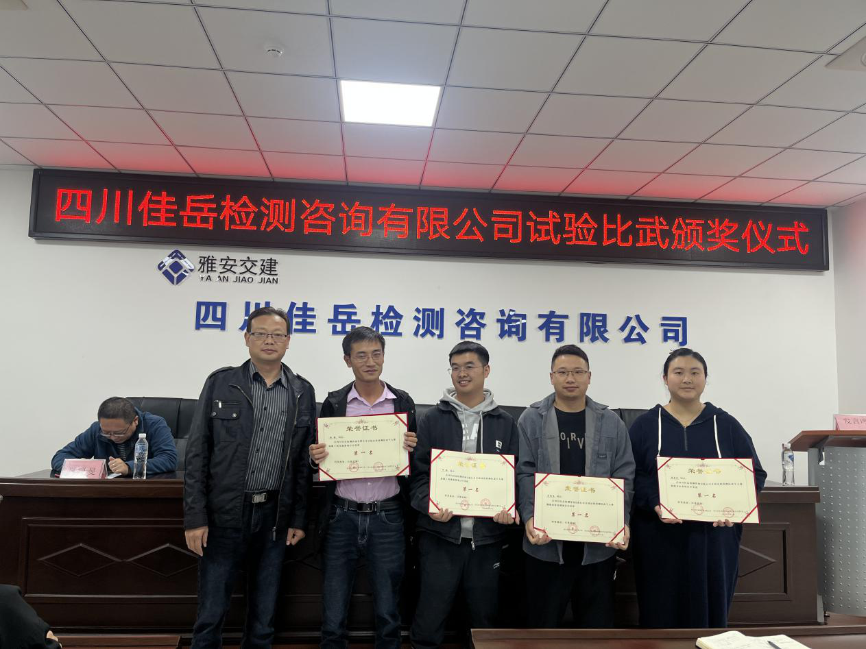 四川佳岳檢測咨詢有限公司第一屆試驗檢測技能比武大賽自10月17日開賽以來,來自四川佳岳檢測咨詢有限公司和雅安市重點工程監(jiān)理單位、工程試驗室的員工積極參加比賽,歷時21天,取得圓滿成功。本次比賽項目設(shè)個人賽7項、團體賽1項,其中團體賽和個人賽分別設(shè)第一、二、三等獎項各1名。最終,佳岳公司以過硬的技能,獲得團體賽第一名,個人賽第一名6項、第二名7項,第三名6項。