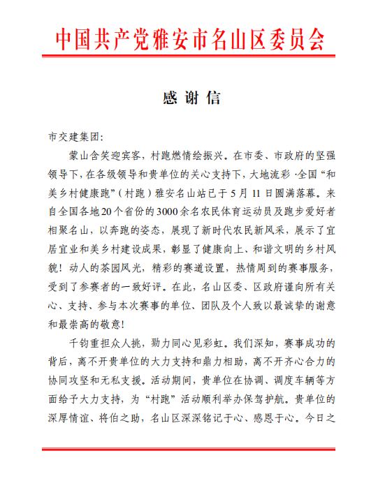 5月10日至11日,以“心向和美 逐夢(mèng)茶源”為主題的大地流彩·2025年全國和美鄉(xiāng)村健康跑(村跑)雅安名山站活動(dòng)在雅安市名山區(qū)成功舉辦。四川蜀通運(yùn)業(yè)有限責(zé)任公司作為運(yùn)輸保障單位,圓滿完成賽事期間各項(xiàng)運(yùn)輸保障任務(wù),為活動(dòng)的順利開展提供了堅(jiān)實(shí)保障,受到名山區(qū)委、區(qū)政府感謝信。