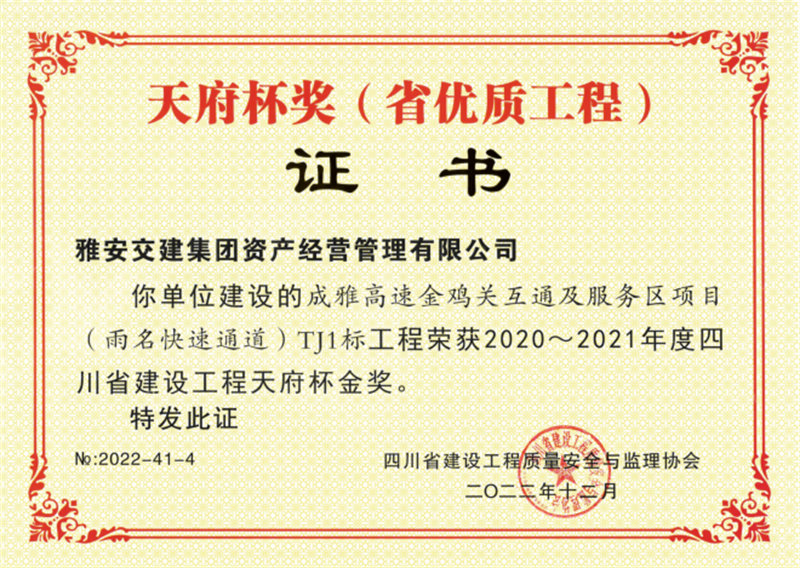 近日,雅安交建集團資產(chǎn)經(jīng)營管理有限公司建設(shè)的成雅高速金雞關(guān)互通及服務(wù)區(qū)項目(雨名快速通道)TJ1標工程榮獲2020-2021年度四川省建設(shè)工程天府杯金獎。