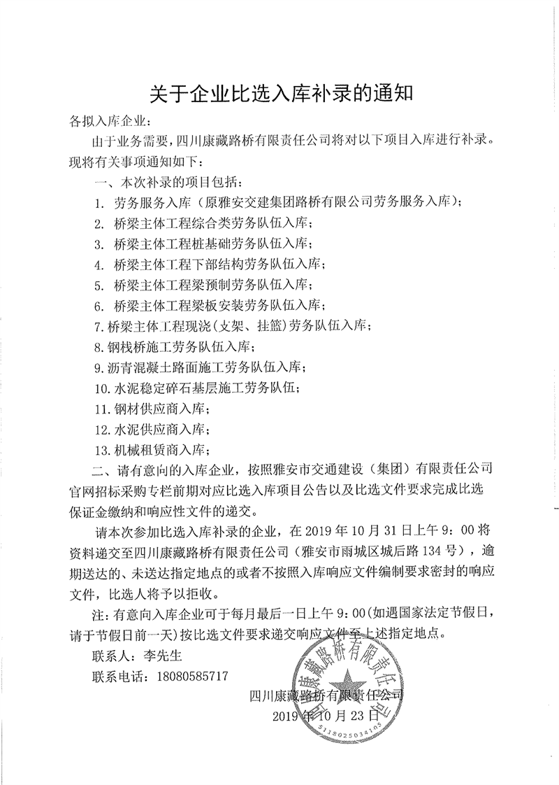 四川康藏路橋有限責(zé)任公司關(guān)于企業(yè)比選入庫補錄的通知