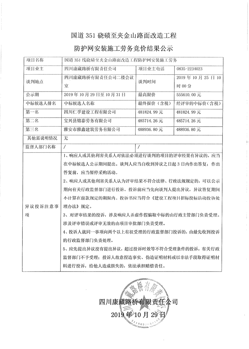 四川康藏路橋有限責(zé)任公司國道351磽磧至夾金山路面改造工程防護(hù)網(wǎng)安裝施工勞務(wù)競價(jià)結(jié)果公示