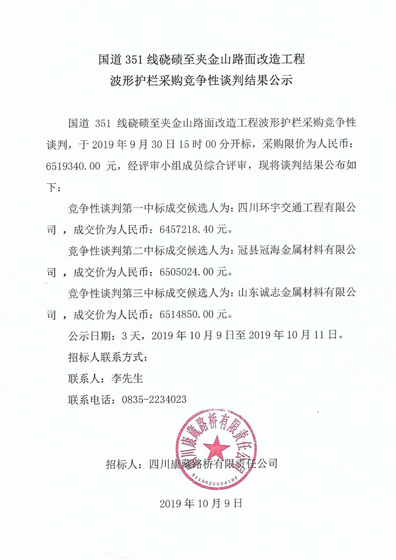 四川康藏路橋有限責(zé)任公司國道351線磽磧至夾金山路面改造工程波形護欄采購競爭性談判結(jié)果公示