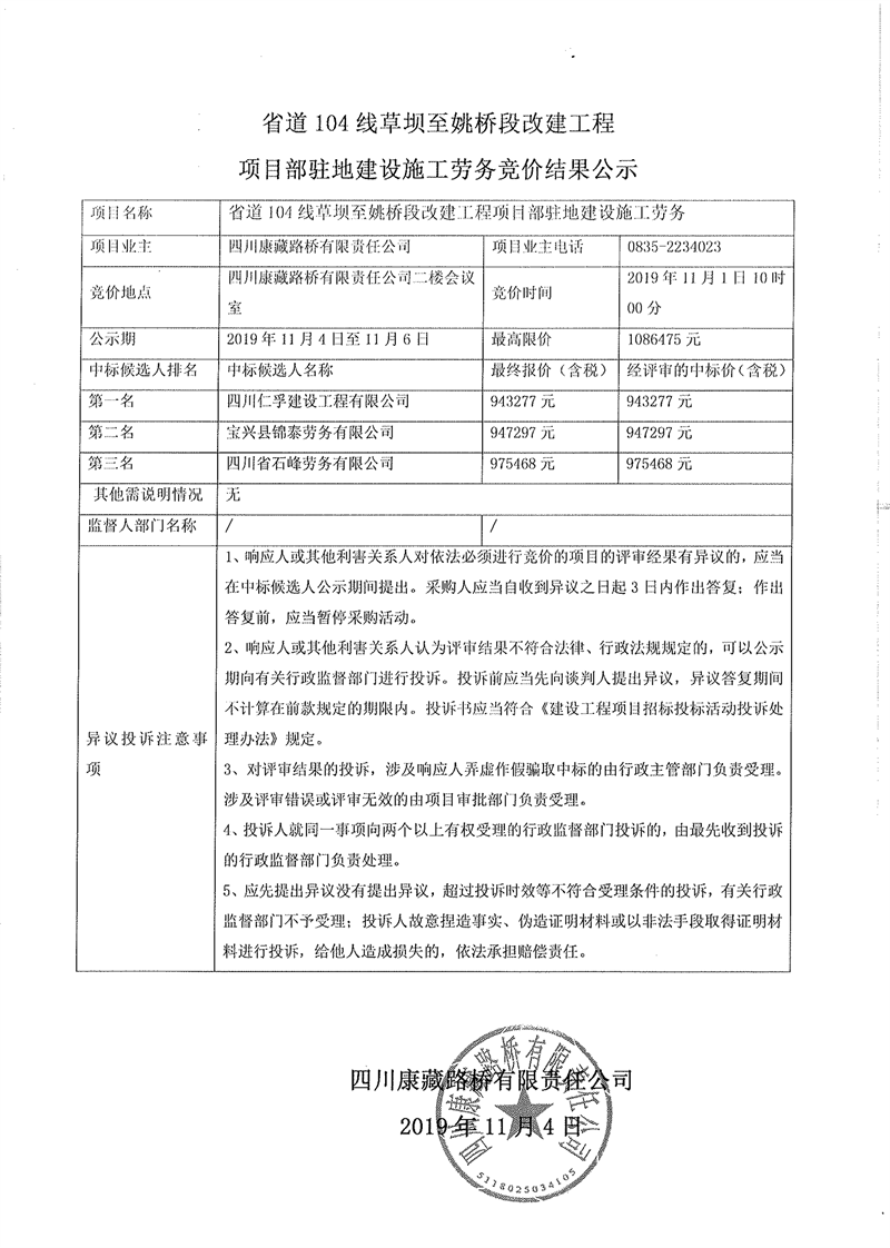四川康藏路橋有限責任公司省道104線草壩至姚橋段改建工程項目部駐地建設施工勞務競價結(jié)果公示