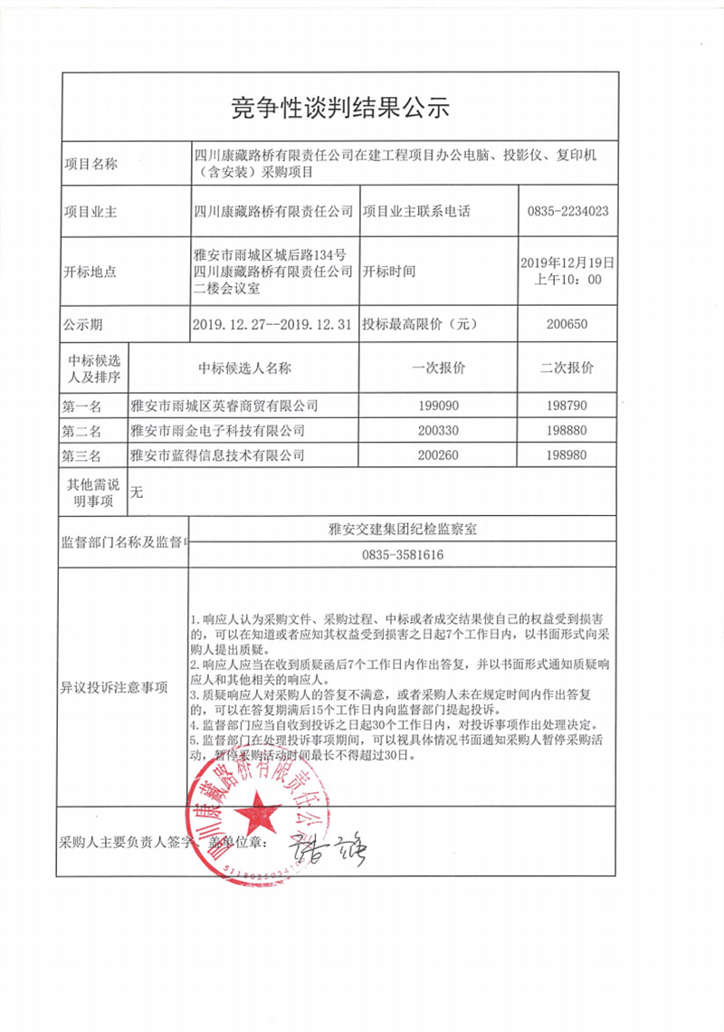 四川康藏路橋有限責(zé)任公司在建工程項(xiàng)目辦公電腦、投影儀、復(fù)印機(jī)(含安裝)采購(gòu)項(xiàng)目競(jìng)爭(zhēng)性談判結(jié)果公示