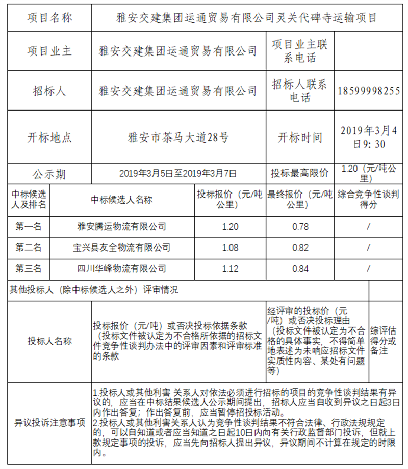 雅安交建集團(tuán)運(yùn)通貿(mào)易有限公司靈關(guān)代碑寺運(yùn)輸項(xiàng)目競爭性談判結(jié)果公示
