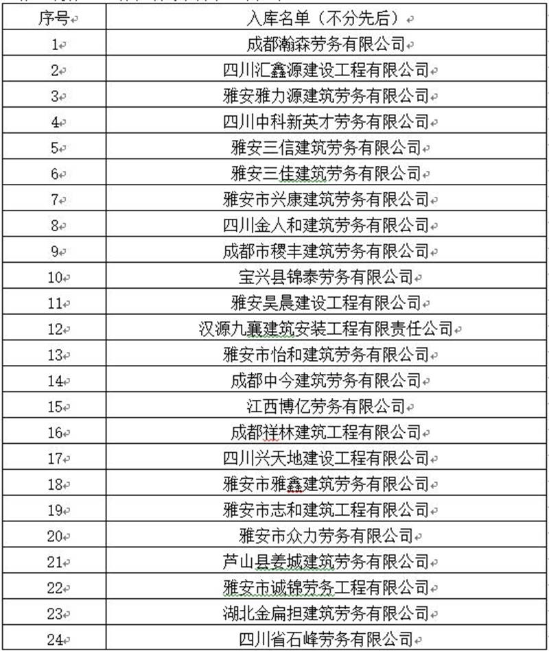 雅安交建集團路橋有限責(zé)任公司勞務(wù)服務(wù)入庫比選項目于2019年5月11日完成開評標(biāo)工作,現(xiàn)將比選結(jié)果即入庫名單公示如下: