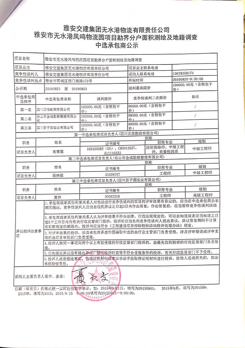 雅安交建集團(tuán)無水港物流有限責(zé)任公司雅安市無水港鳳鳴物流園項目勘界分戶面積測繪及地籍調(diào)查中選承包商公示