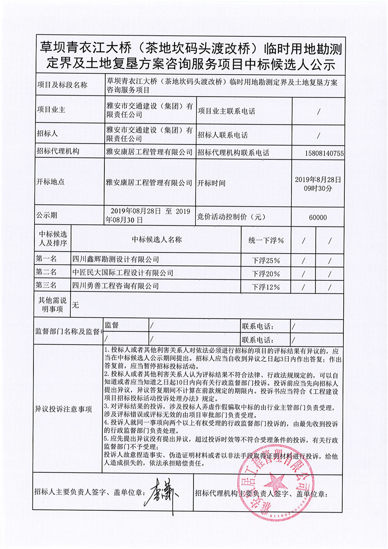 雅安市交通建設(集團)有限責任公司草壩青衣江大橋(茶地坎碼頭渡改橋)臨時用地勘測定界及土地復墾方案咨詢服務項目競價結(jié)果公示