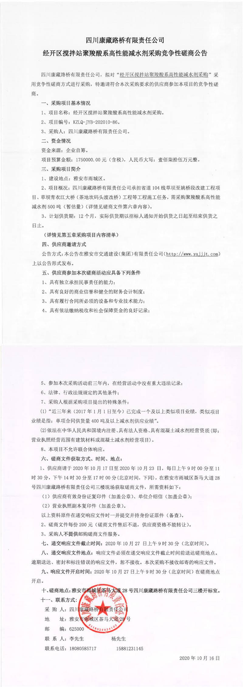 四川康藏路橋有限責任公司經開區(qū)攪拌站聚羧酸系高性能減水劑采購競爭性磋商公告