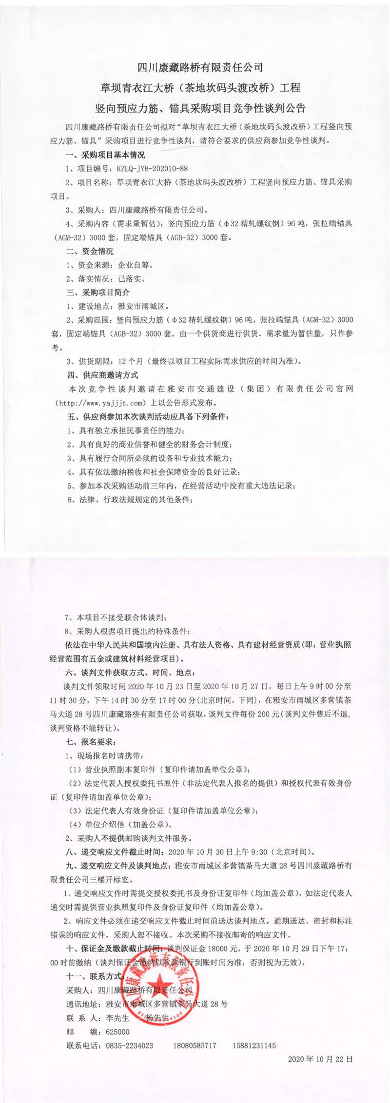 四川康藏路橋有限責(zé)任公司草壩青衣江大橋(茶地坎碼頭渡改橋)工程豎向預(yù)應(yīng)力筋、錨具采購項(xiàng)目競(jìng)爭(zhēng)性談判公告