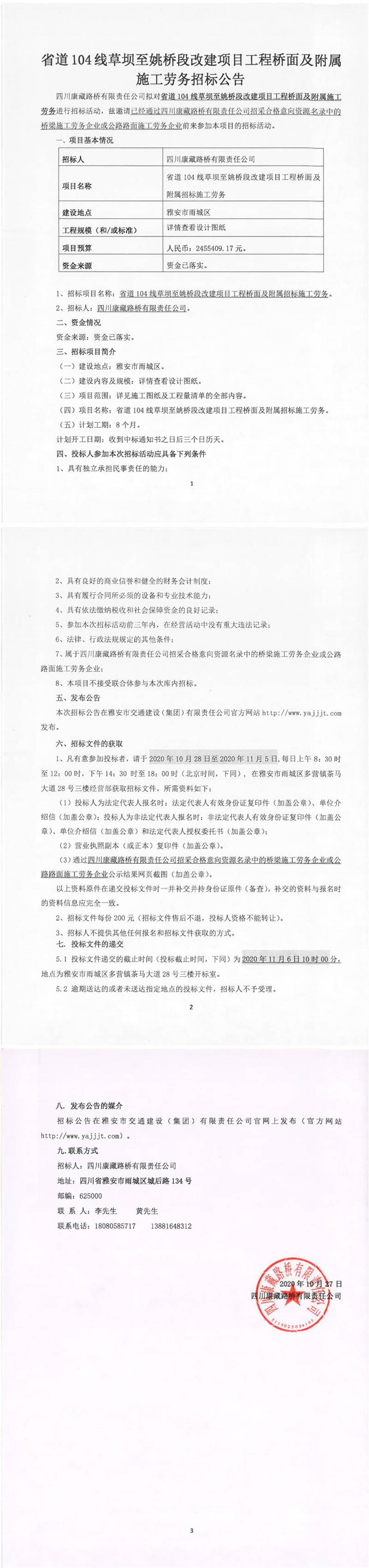 四川康藏路橋有限責任公司省道104線草壩至姚橋段改建項目工程橋面及附屬施工勞務招標公告
