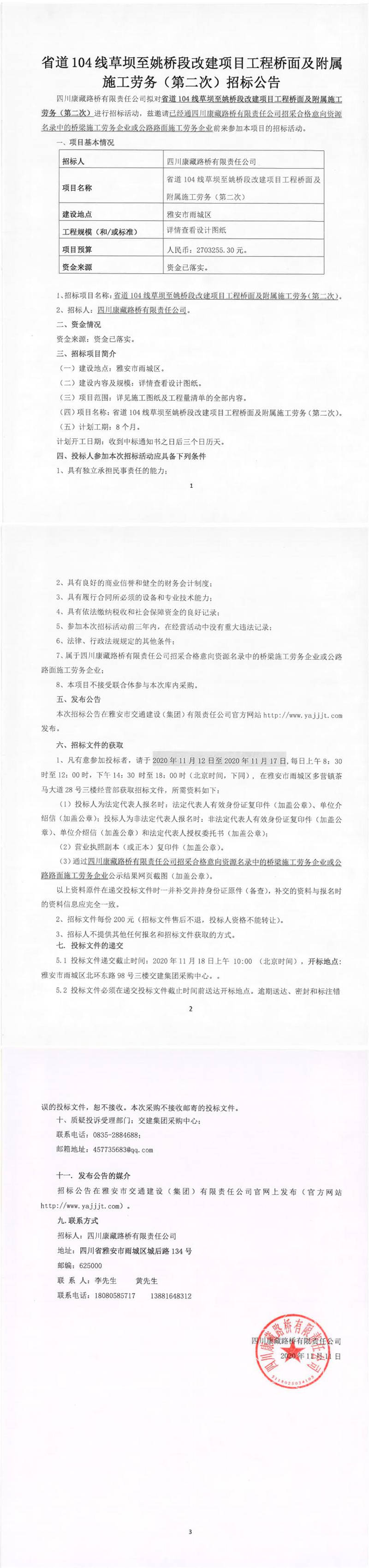 四川康藏路橋有限責(zé)任公司省道104線草壩至姚橋段改建項(xiàng)目工程橋面及附屬施工勞務(wù)(第二次)招標(biāo)公告