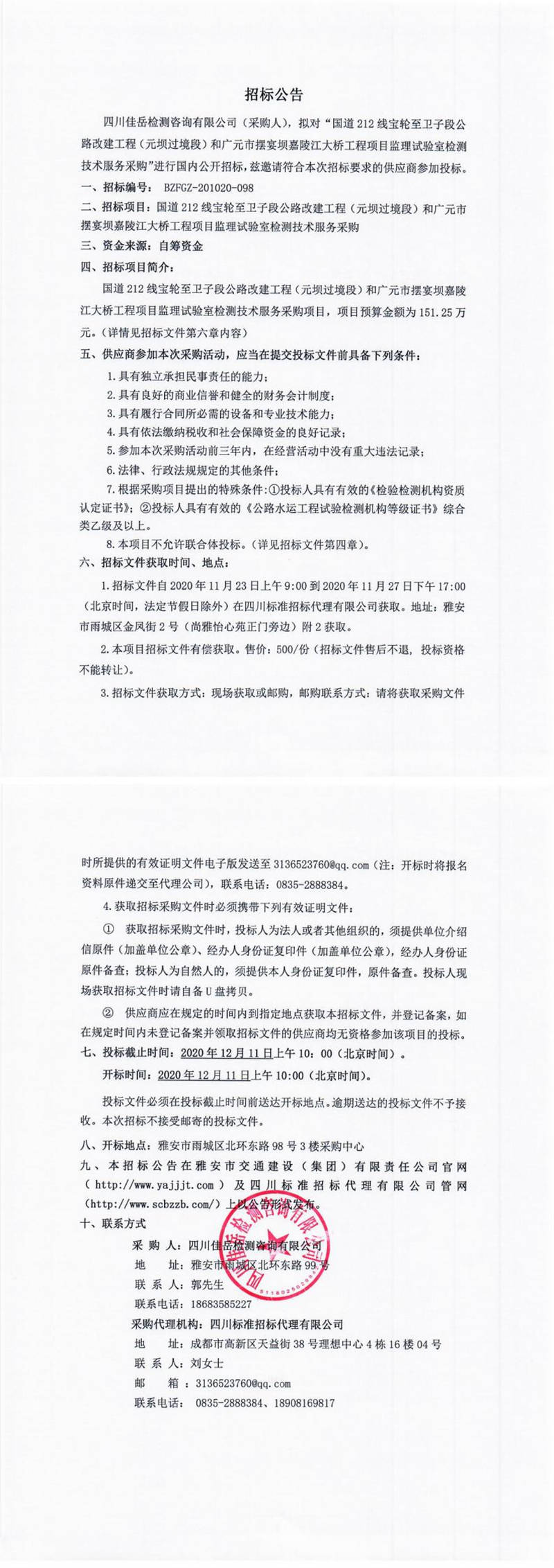 四川佳岳檢測咨詢有限公司國道212線寶輪至衛(wèi)子段公路改建工程(元壩過境段)和廣元市擺宴壩嘉陵江大橋工程項目監(jiān)理試驗室檢測技術(shù)服務(wù)采購招標(biāo)公告