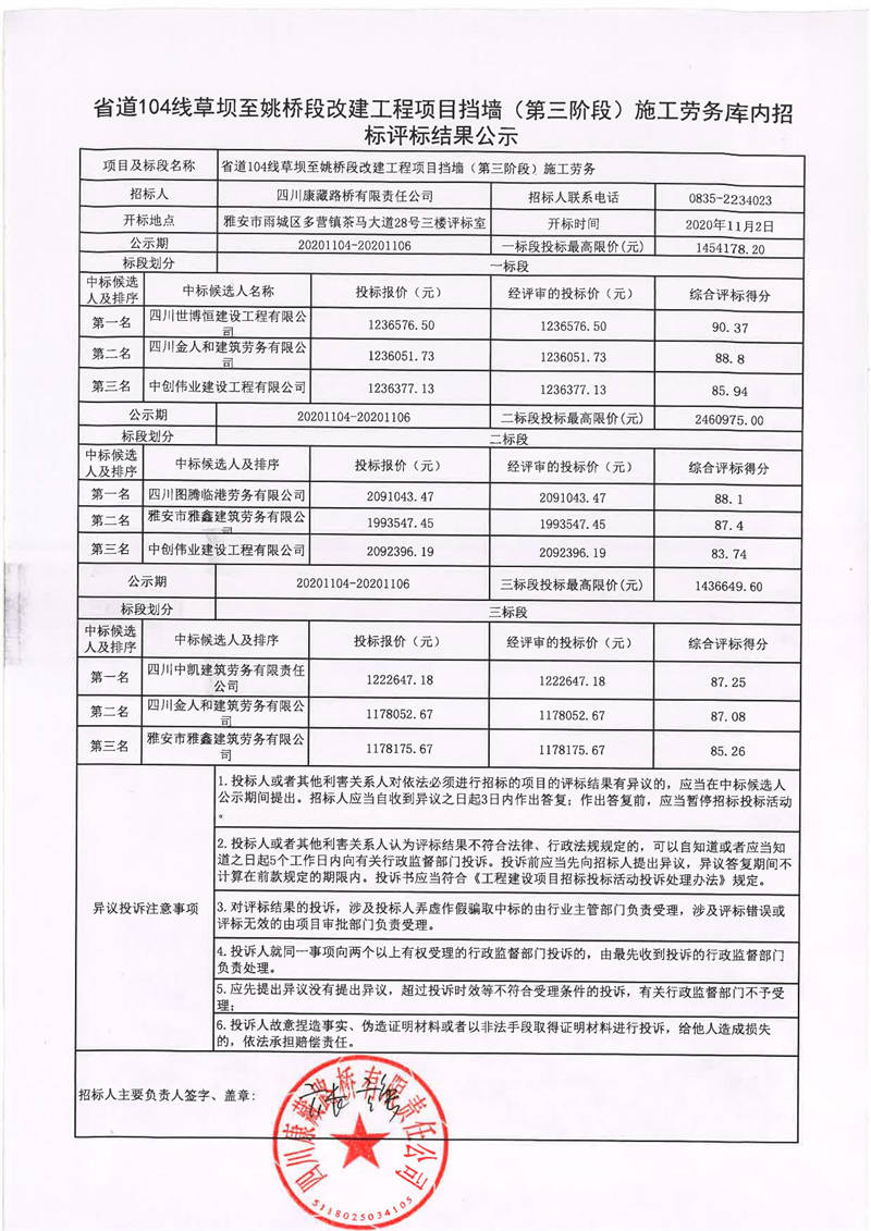 四川康藏路橋有限責(zé)任公司省道104線草壩至姚橋段改建工程項(xiàng)目擋墻(第三階段)施工勞務(wù)庫內(nèi)招標(biāo)評標(biāo)結(jié)果公示
