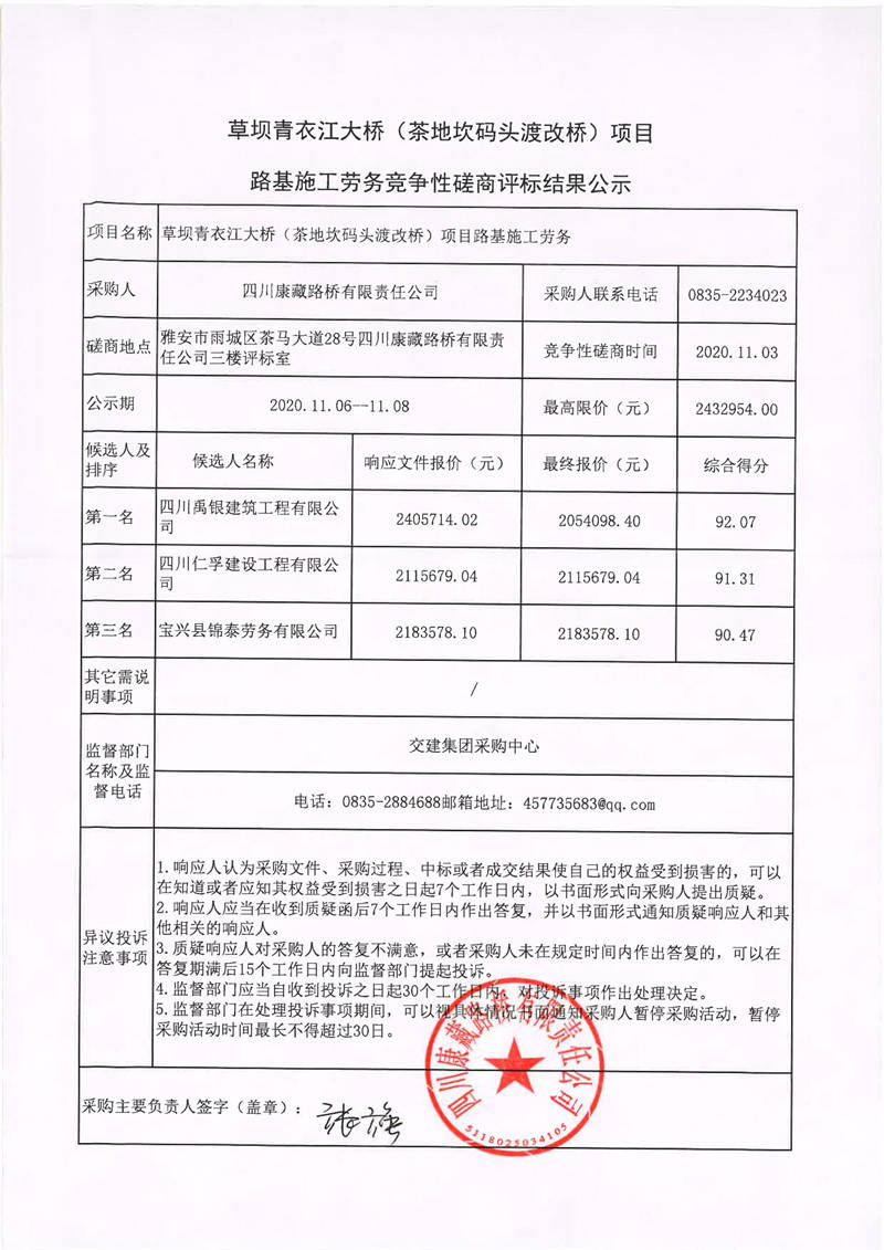 四川康藏路橋有限責(zé)任公司草壩青衣江大橋(茶地坎碼頭渡改橋)項(xiàng)目路基施工勞務(wù)競(jìng)爭(zhēng)性磋商評(píng)標(biāo)結(jié)果公示