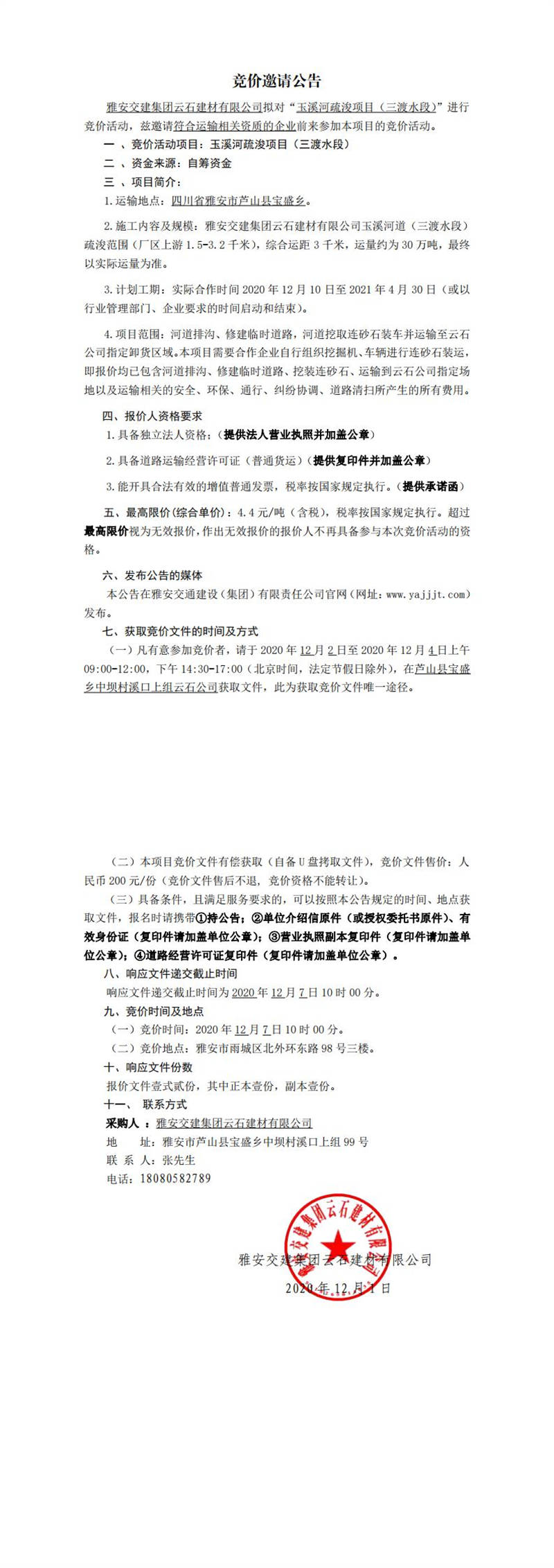 雅安交建集團(tuán)云石建材有限公司玉溪河疏浚項目(三渡水段)競價公告