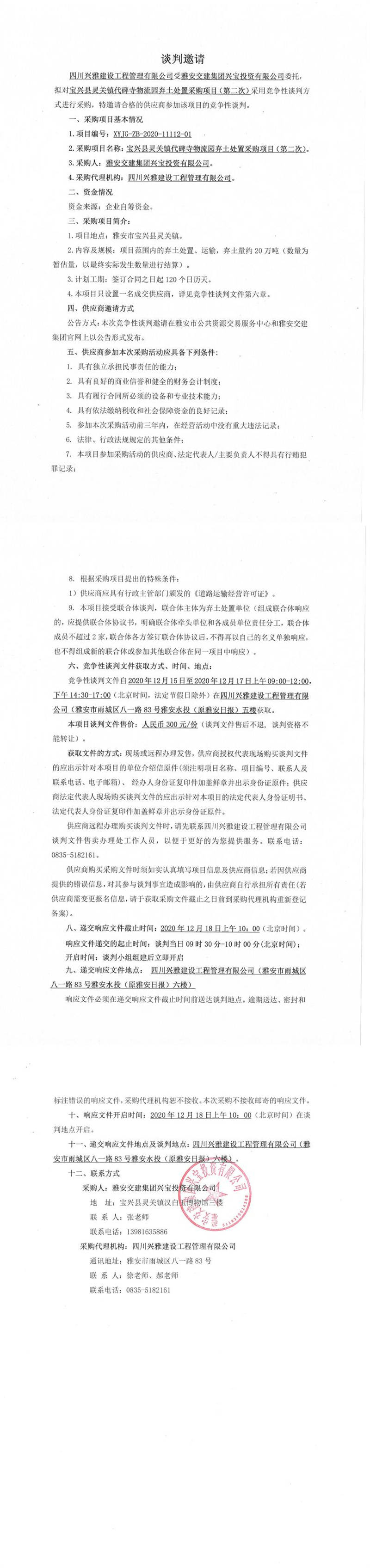 雅安交建集團(tuán)興寶投資有限公司寶興縣靈關(guān)鎮(zhèn)代碑寺物流園棄土處置采購項(xiàng)目(第二次)談判公告