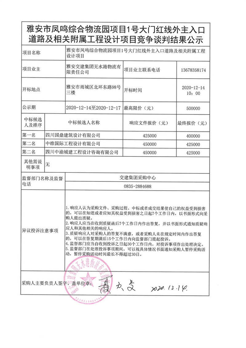 雅安交建集團(tuán)無(wú)水港物流有限責(zé)任公司雅安市鳳鳴綜合物流園項(xiàng)目1號(hào)大門紅線外主入口道路及相關(guān)附屬工程設(shè)計(jì)項(xiàng)目談判結(jié)果公示