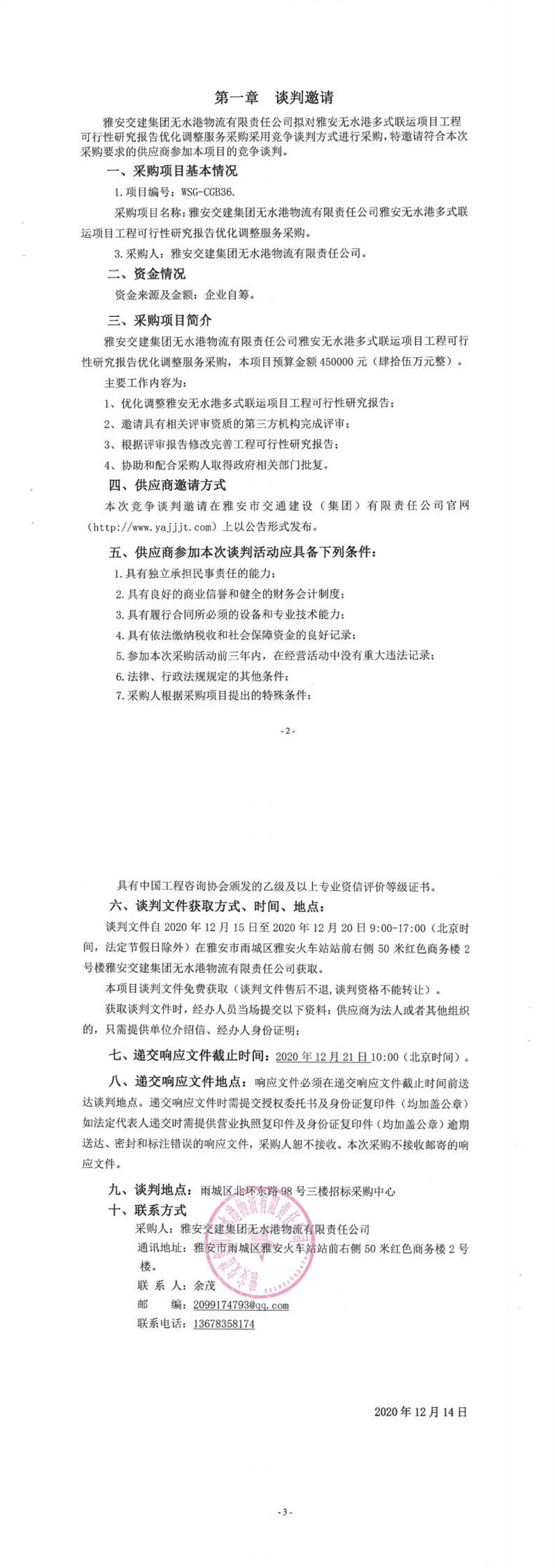 雅安交建集團(tuán)無(wú)水港物流有限責(zé)任公司雅安無(wú)水港多式聯(lián)運(yùn)項(xiàng)目工程可行性研究報(bào)告優(yōu)化調(diào)整服務(wù)采購(gòu)競(jìng)爭(zhēng)談判公告