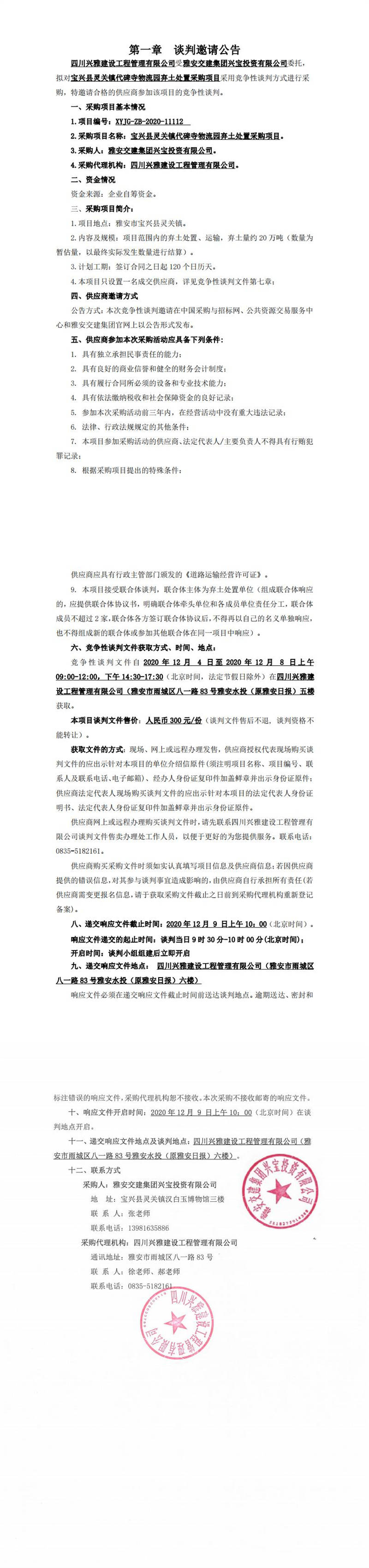 雅安交建集團興寶投資有限公司寶興縣靈關(guān)鎮(zhèn)代碑寺物流園棄土處置采購項目談判公告