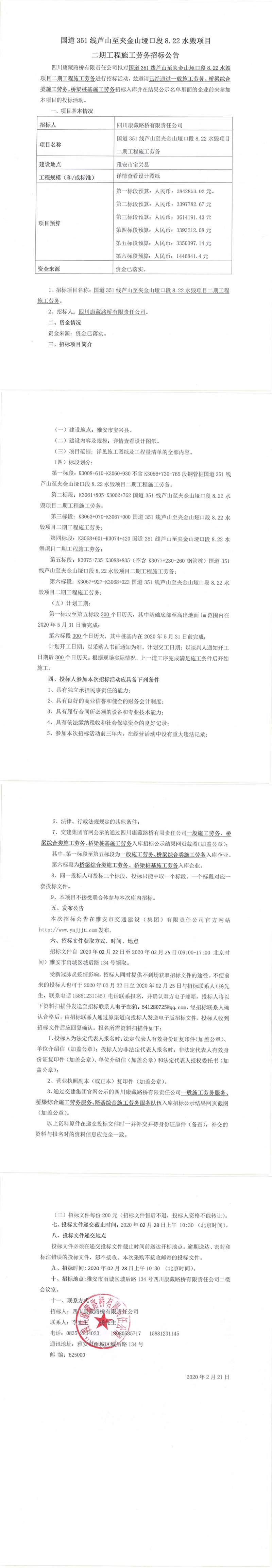四川康藏路橋有限責任公司國道351線蘆山至夾金山埡口段8.22水毀項目二期工程施工勞務(wù)招標公告