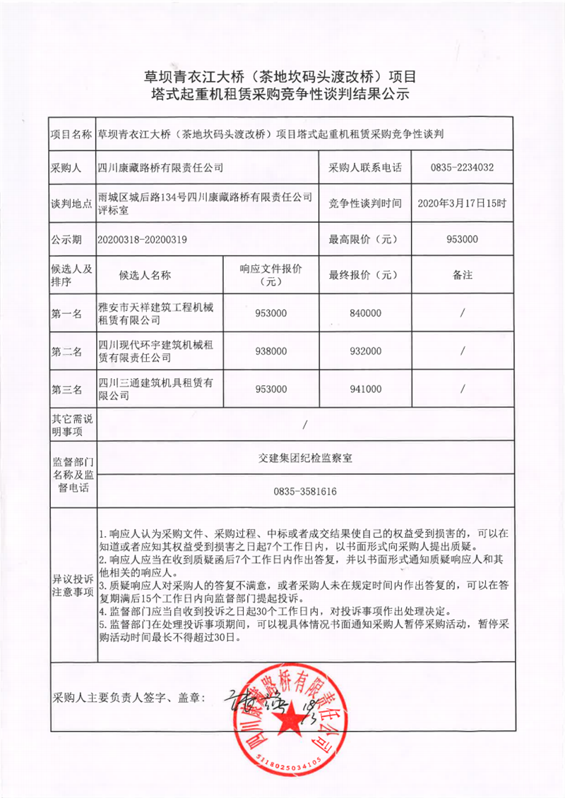 四川康藏路橋有限責(zé)任公司草壩青衣江大橋(茶地坎渡改橋)項目塔式起重機租賃采購競爭性談判結(jié)果公示