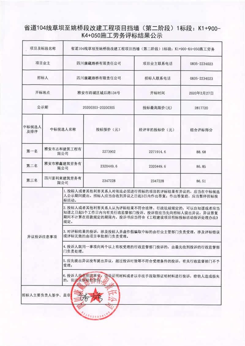 四川康藏路橋有限責任公司省道104線草壩至姚橋段改建工程項目擋墻(第二階段)1標段:K1+900-K4+050施工勞務(wù)評標結(jié)果公示