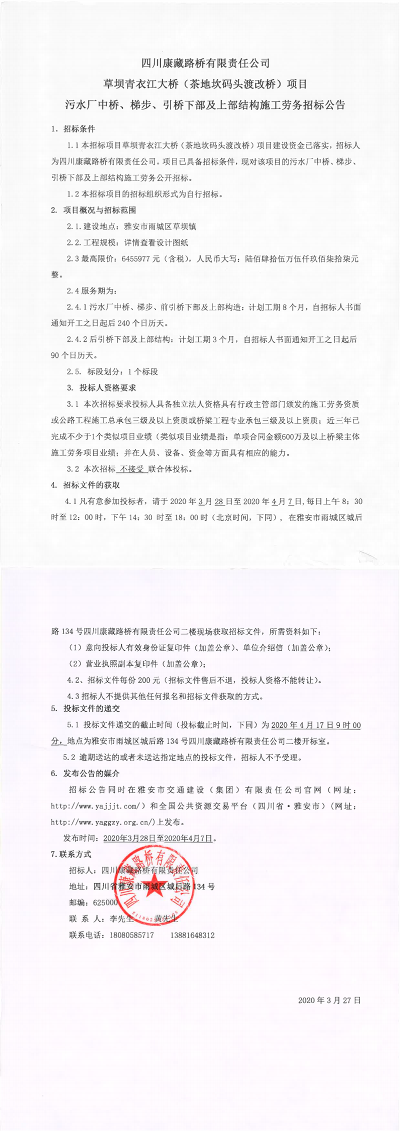 四川康藏路橋有限責(zé)任公司草壩青衣江大橋(茶地坎碼頭渡改橋)項目污水廠中橋、梯步、引橋下部及上部結(jié)構(gòu)施工勞務(wù)招標(biāo)公告