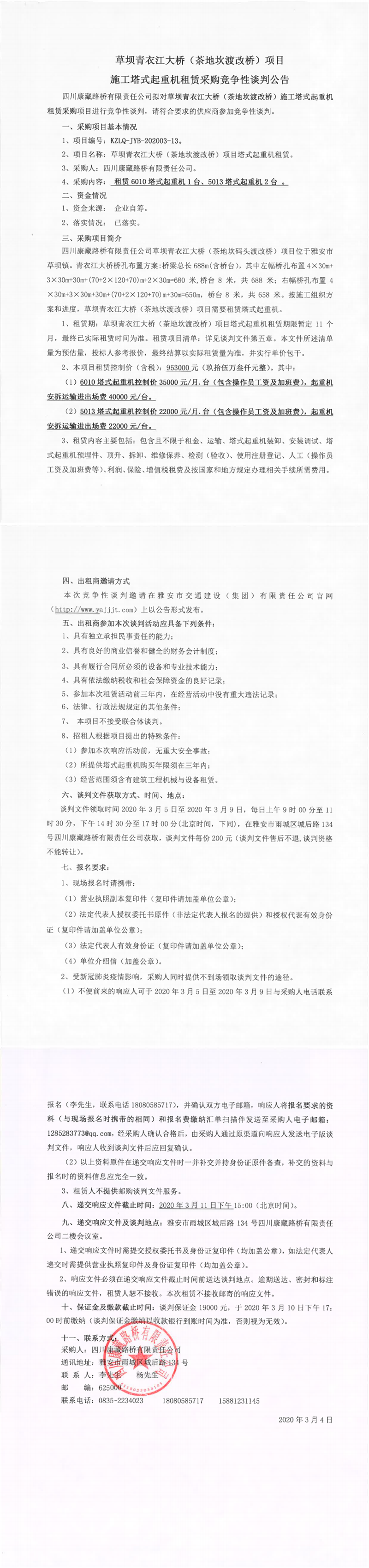 四川康藏路橋有限責(zé)任公司草壩青衣江大橋(茶地坎渡改橋)項(xiàng)目施工塔式起重機(jī)租賃采購競(jìng)爭(zhēng)性談判公告