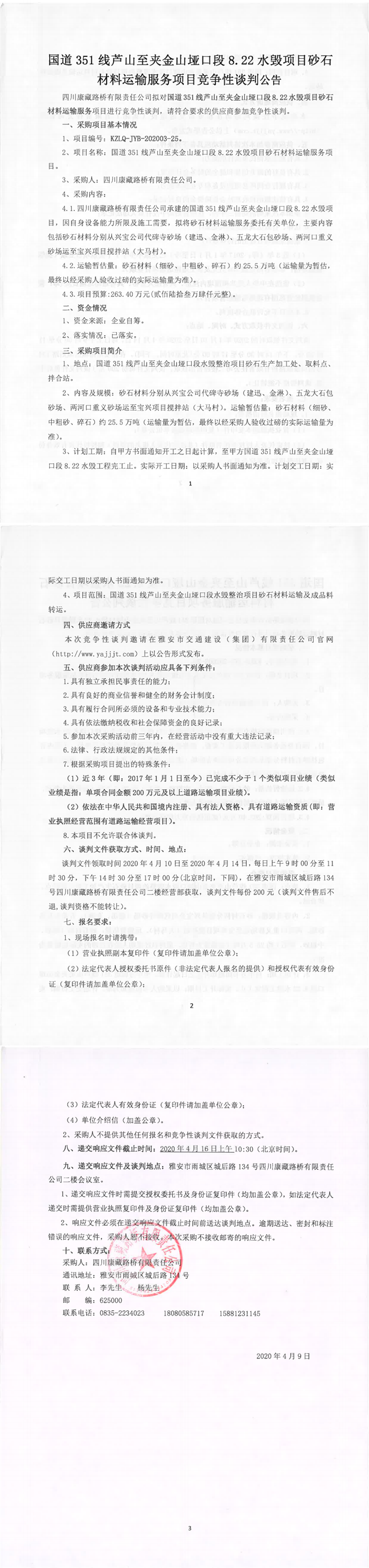 四川康藏路橋有限責(zé)任公司國道351線蘆山至夾金山埡口8.22水毀項目砂石材料運輸服務(wù)項目競爭性談判公告