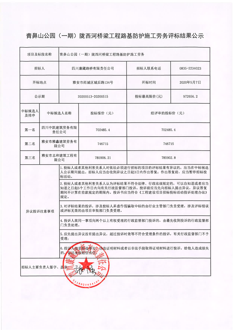 四川康藏路橋有限責(zé)任公司青鼻山公園(一期)隴西河橋梁工程路基防護施工勞務(wù)評標(biāo)結(jié)果公示