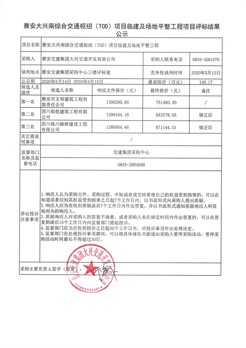 雅安交建集團(tuán)大興交通開(kāi)發(fā)有限公司雅安大興南綜合交通樞紐(TOD)項(xiàng)目臨建及場(chǎng)地平整工程項(xiàng)目評(píng)標(biāo)結(jié)果公示
