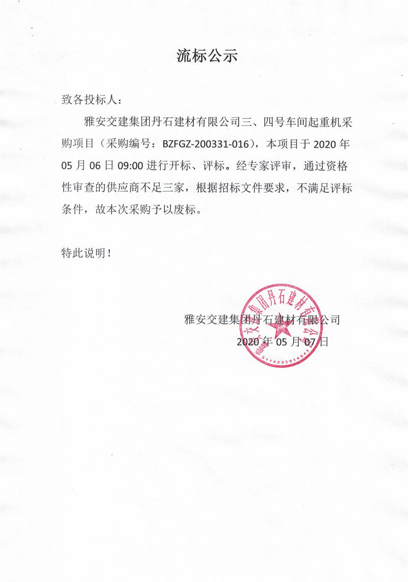 雅安交建集團(tuán)丹石建材有限公司三、四號車間起重機(jī)采購項目流標(biāo)公示