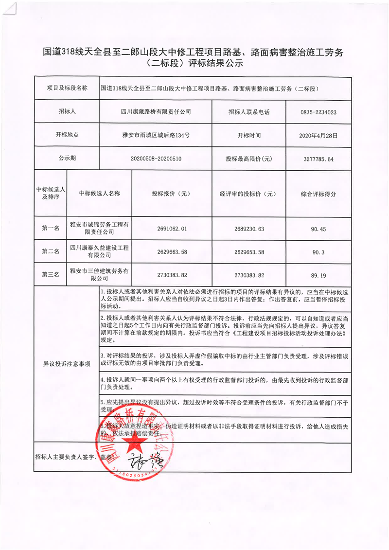 四川康藏路橋有限責(zé)任公司國道318線天全縣至二郎山段大中修工程項目路基、路面病害整治施工勞務(wù)(二標(biāo)段)評標(biāo)結(jié)果公示