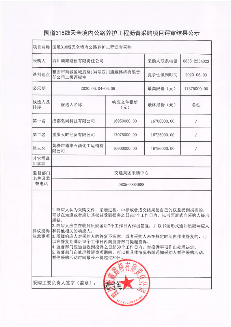 四川康藏路橋有限責(zé)任公司國道318線天全境內(nèi)公路養(yǎng)護(hù)工程瀝青采購項(xiàng)目評(píng)審結(jié)果公示