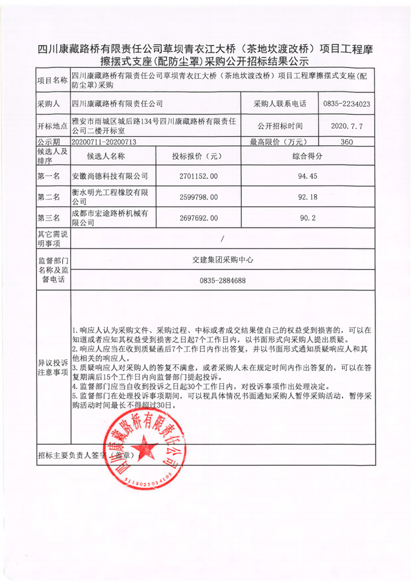四川康藏路橋有限責(zé)任公司草壩青衣江大橋(茶地坎渡改橋)項目工程摩擦擺式支座(配防塵罩)采購公開招標結(jié)果公示