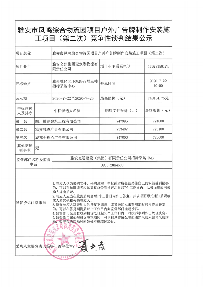 雅安交建集團(tuán)無水港物流有限責(zé)任公司雅安市鳳鳴綜合物流園項(xiàng)目戶外廣告牌制作安裝施工項(xiàng)目(第二次)競爭性談判結(jié)果公示