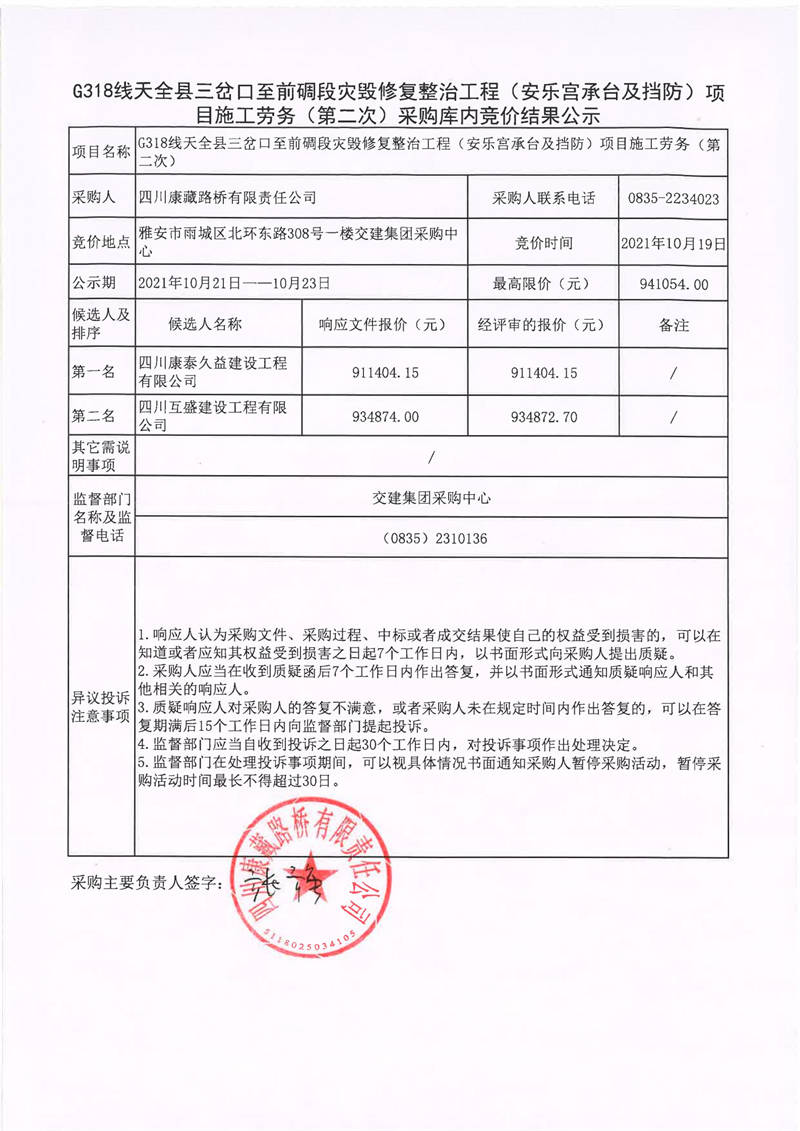 四川康藏路橋有限責任公司G318線天全縣三岔口至前碉段災(zāi)毀修復整治工程(安樂宮承臺及擋防)項目施工勞務(wù)(第二次)采購庫內(nèi)競價結(jié)果公示