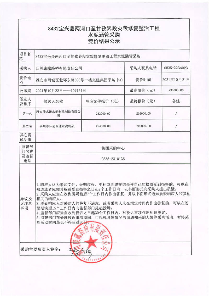 四川康藏路橋有限責任公司S432線寶興縣兩河口至甘孜界段災(zāi)毀修復(fù)整治工程水泥涵管采購競價結(jié)果公示