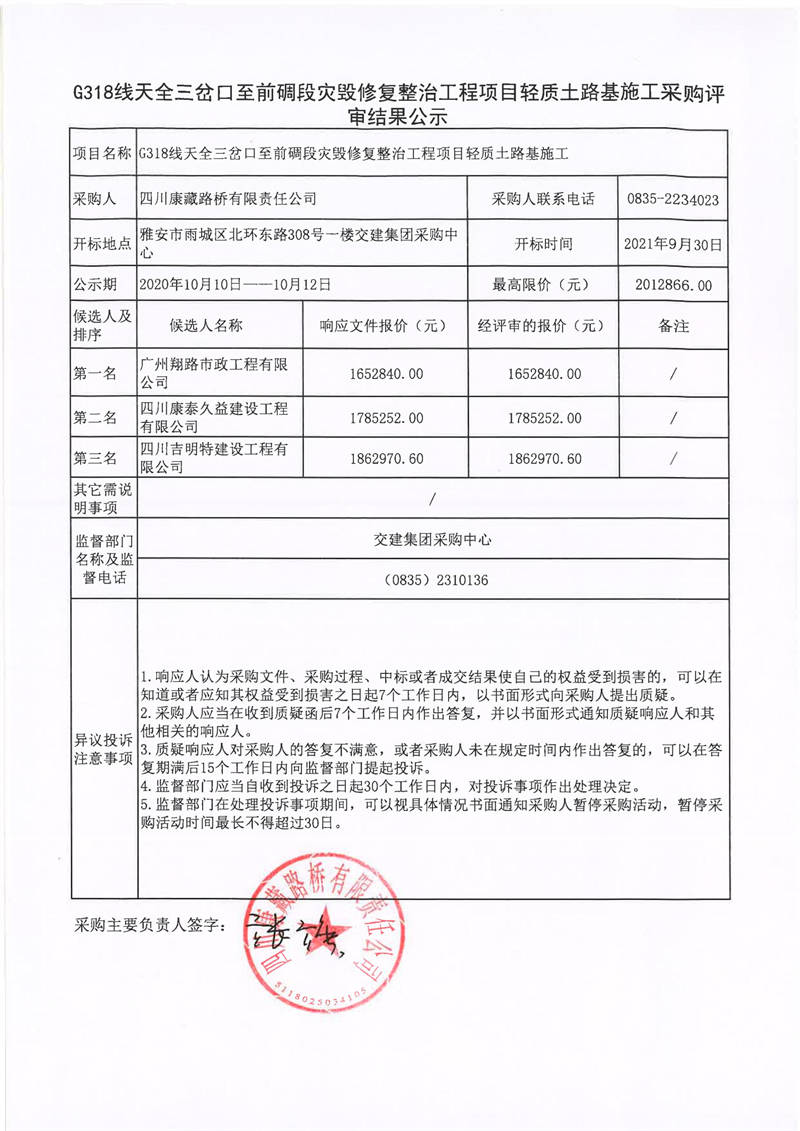 四川康藏路橋有限責(zé)任公司G318線天全三岔口至前碉段災(zāi)毀修復(fù)整治工程項(xiàng)目輕質(zhì)土路基施工采購評審結(jié)果公示