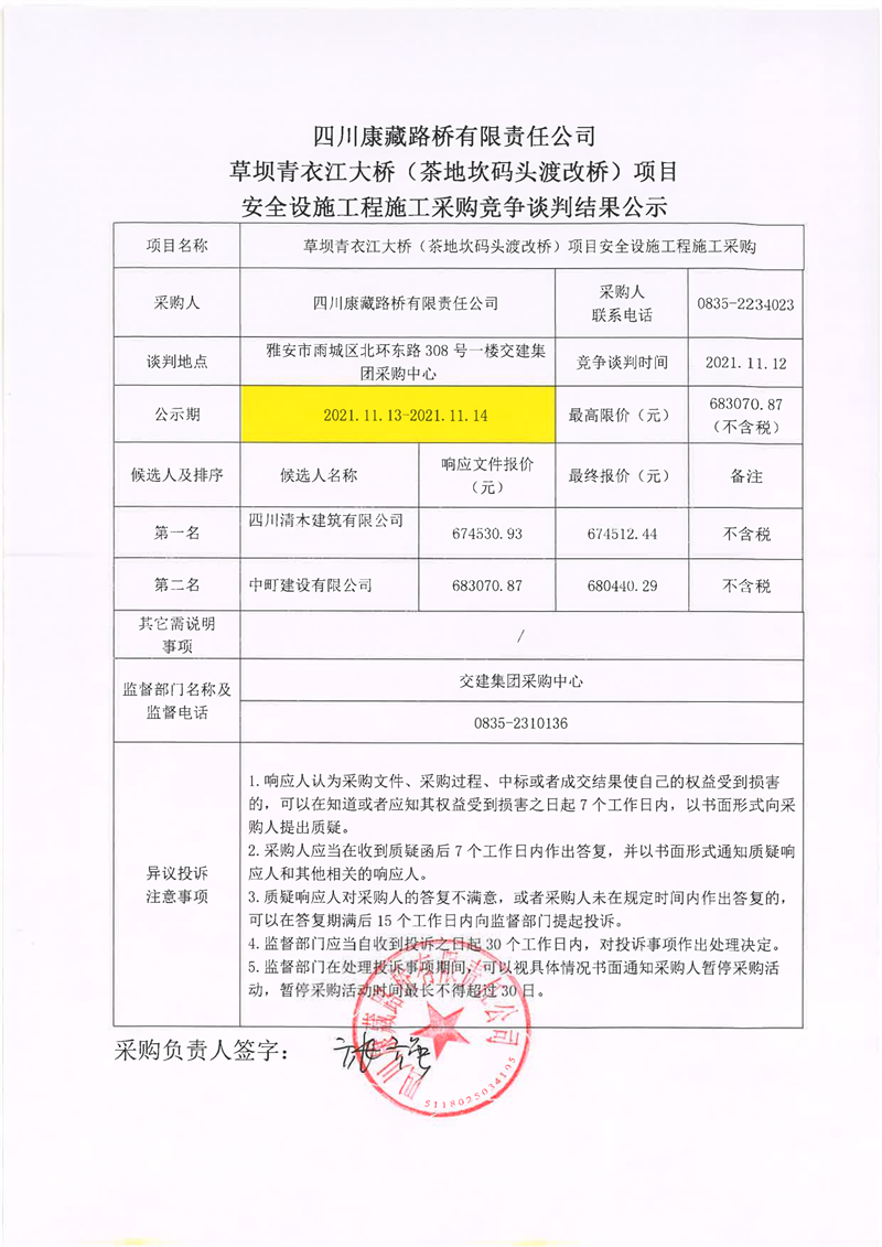 四川康藏路橋有限責(zé)任公司草壩青衣江大橋(茶地坎碼頭渡改橋)項(xiàng)目安全設(shè)施施工采購(gòu)競(jìng)爭(zhēng)談判結(jié)果公示