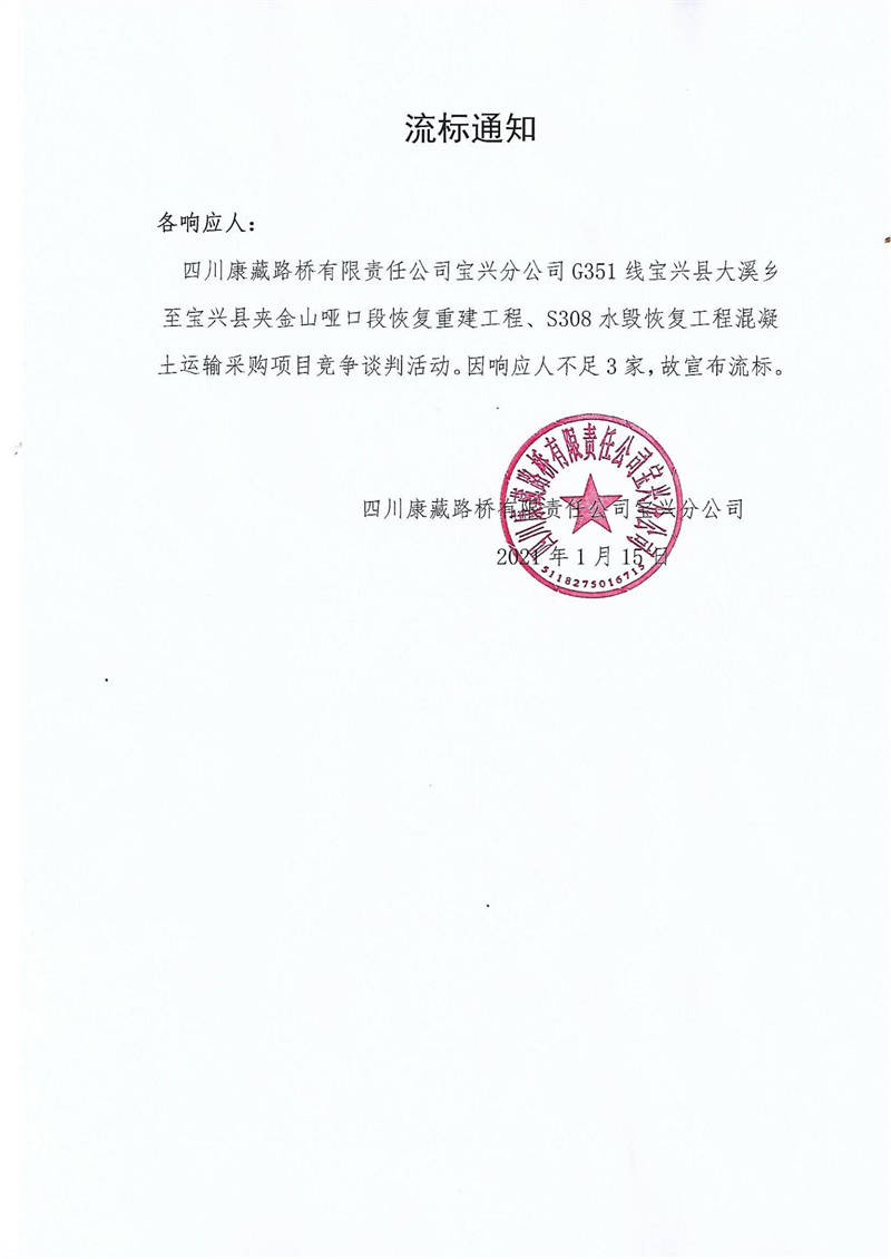 四川康藏路橋有限責(zé)任公司寶興分公司G351線寶興縣大溪鄉(xiāng)至寶興縣夾金山啞口段恢復(fù)重建工程、S308水毀恢復(fù)工程混凝土運輸采購項目流標通知
