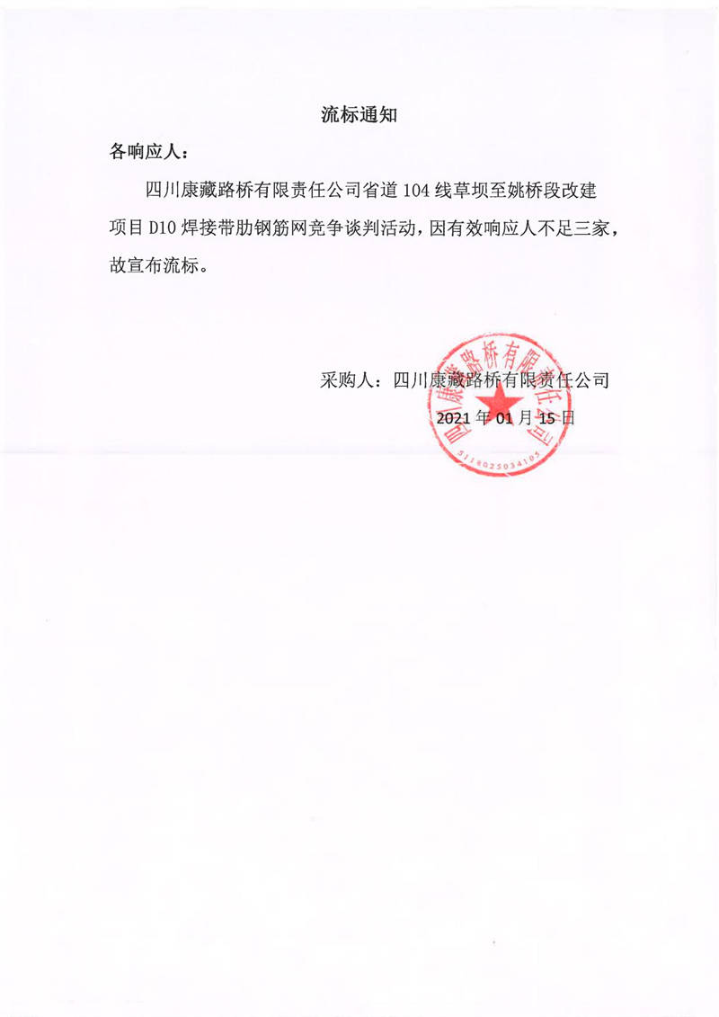 四川康藏路橋有限責任公司省道104線草壩至姚橋段改建項目D10焊接帶肋鋼筋網(wǎng)采購項目流標通知