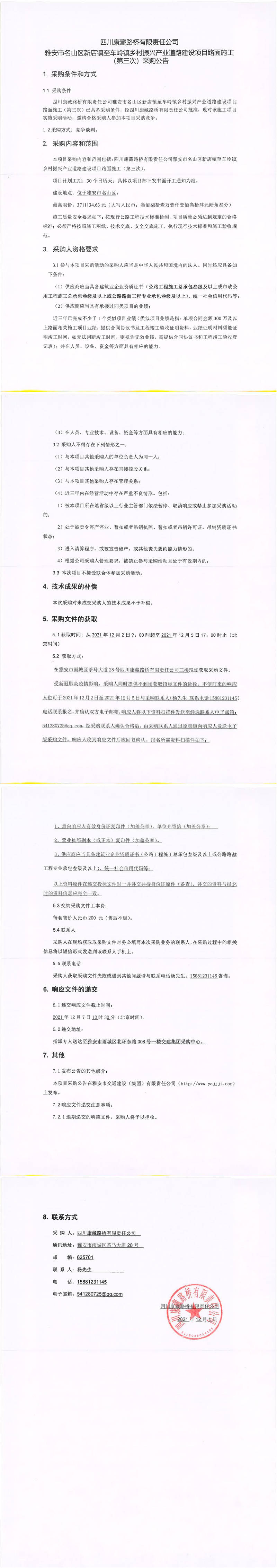 四川康藏路橋有限責(zé)任公司雅安市名山區(qū)新店鎮(zhèn)至車嶺鎮(zhèn)鄉(xiāng)村振興產(chǎn)業(yè)道路建設(shè)項(xiàng)目路面施工(第三次)采購(gòu)公告