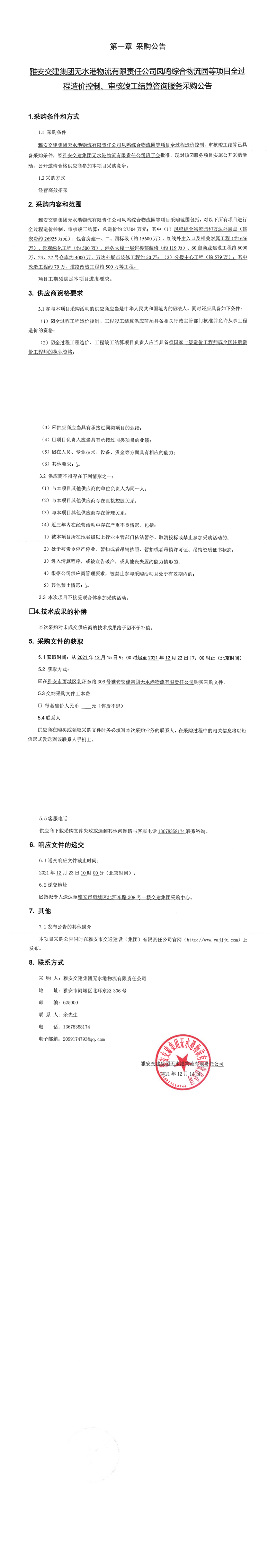 雅安交建集團無水港物流有限責任公司鳳鳴綜合物流等項目全過程造價控制、審核竣工結(jié)算咨詢服務采購公告