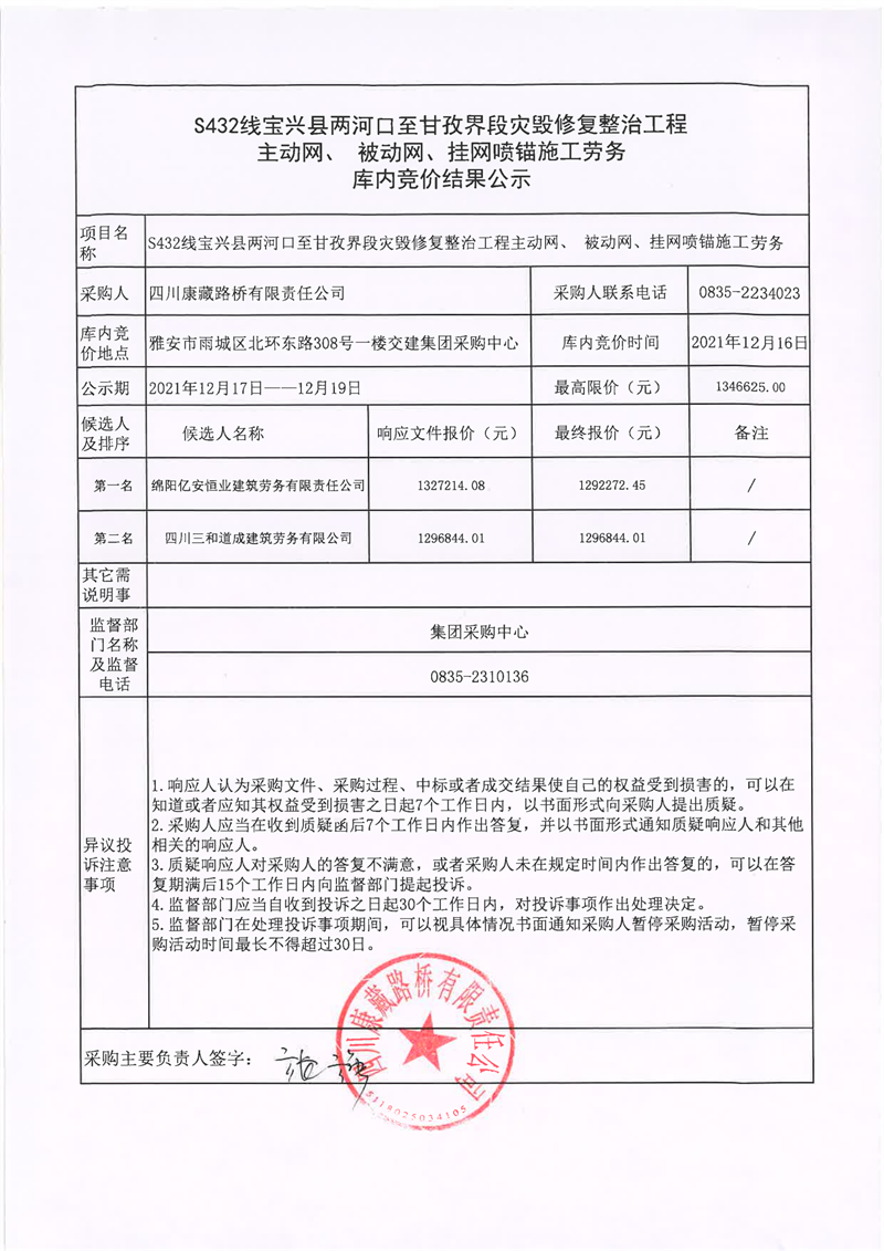 四川康藏路橋有限責任公司S432線寶興縣兩河口至甘孜界段災毀修復整治工程主動網(wǎng)、補動網(wǎng)、掛網(wǎng)噴錨施工勞務庫內(nèi)競價結(jié)果公示