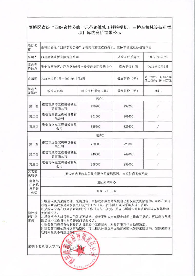 四川康藏路橋有限責(zé)任公司雨城區(qū)省級“四好農(nóng)村路”示范路維修工程挖掘機(jī)、三橋車機(jī)械設(shè)備租賃項目庫內(nèi)競價結(jié)果公示