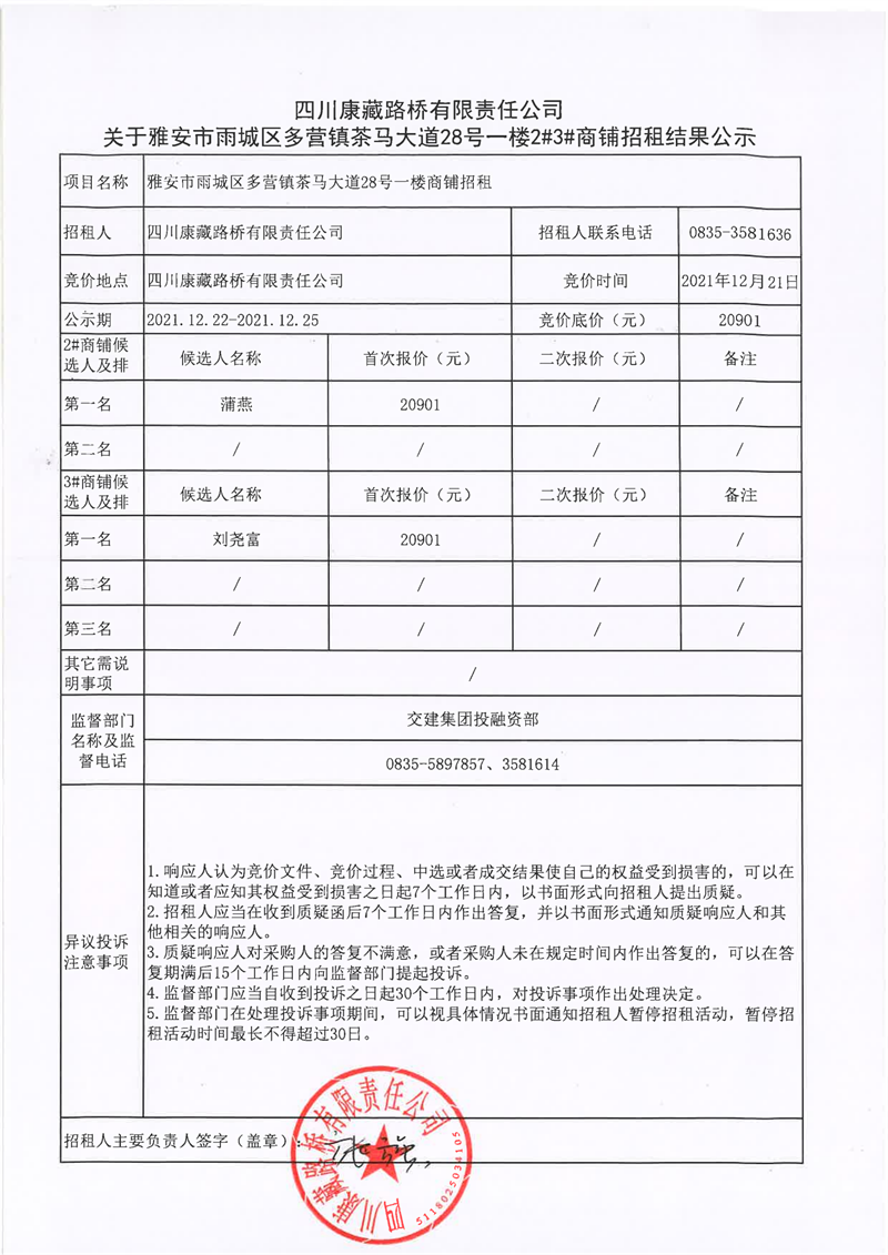 四川康藏路橋有限責任公司關于雅安市雨城區(qū)多營鎮(zhèn)茶馬大道28號一樓2#3#商鋪招租結果公示