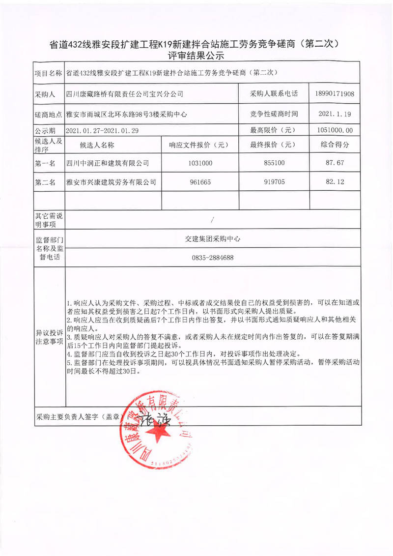 四川康藏路橋有限責任公司寶興分公司省道432線雅安段擴建工程K19新建拌合站施工勞務競爭磋商(第二次)評審結果公示
